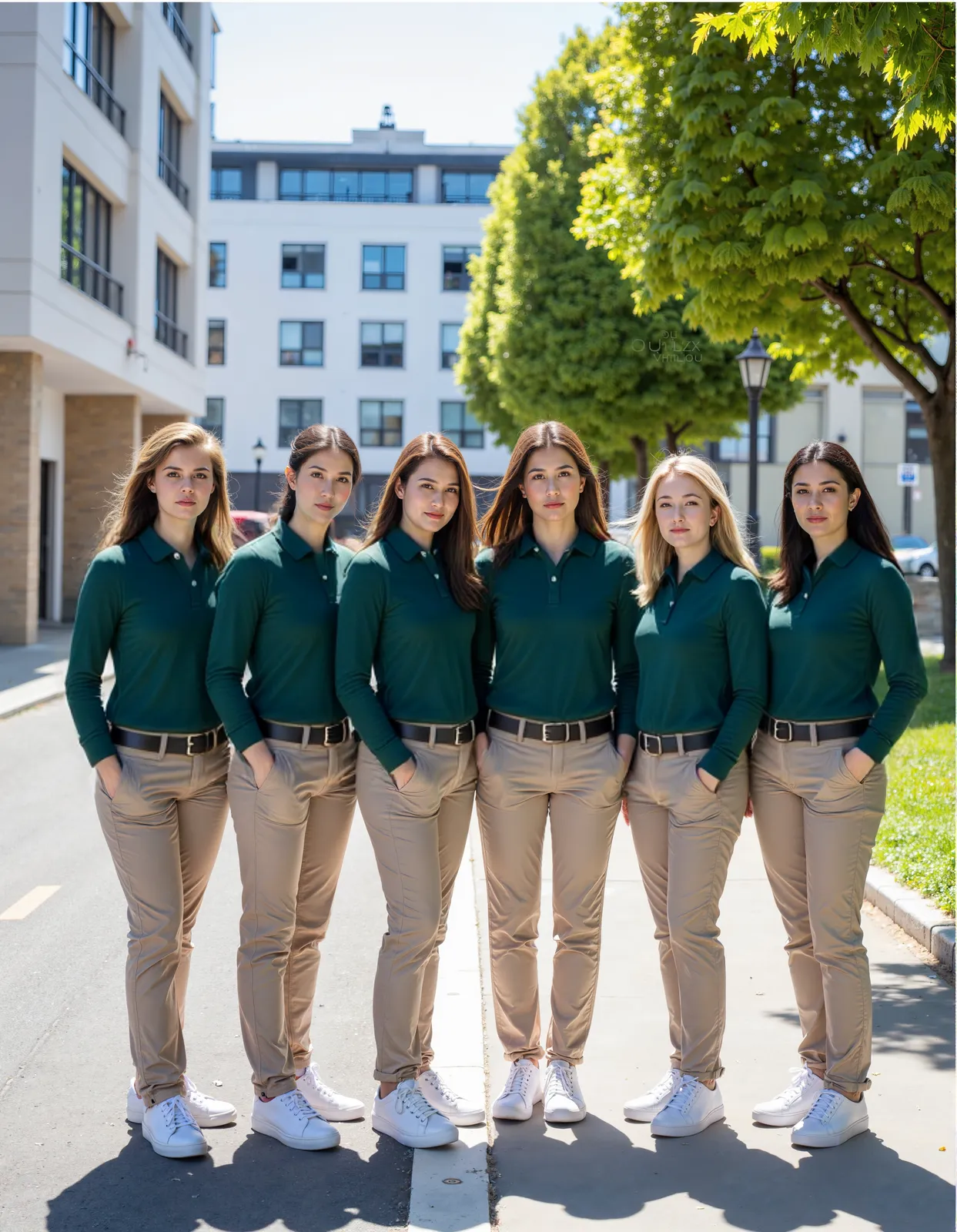 Six women stand in a row outdoors on a sunny day, wearing matching dark green long-sleeve polo shirts, khaki pants with black belts, and white sneakers. Each has one hand in a pocket, looking neat and unified. The background features modern buildings and lush green trees, creating a bright, cheerful urban setting that conveys a sense of teamwork.
