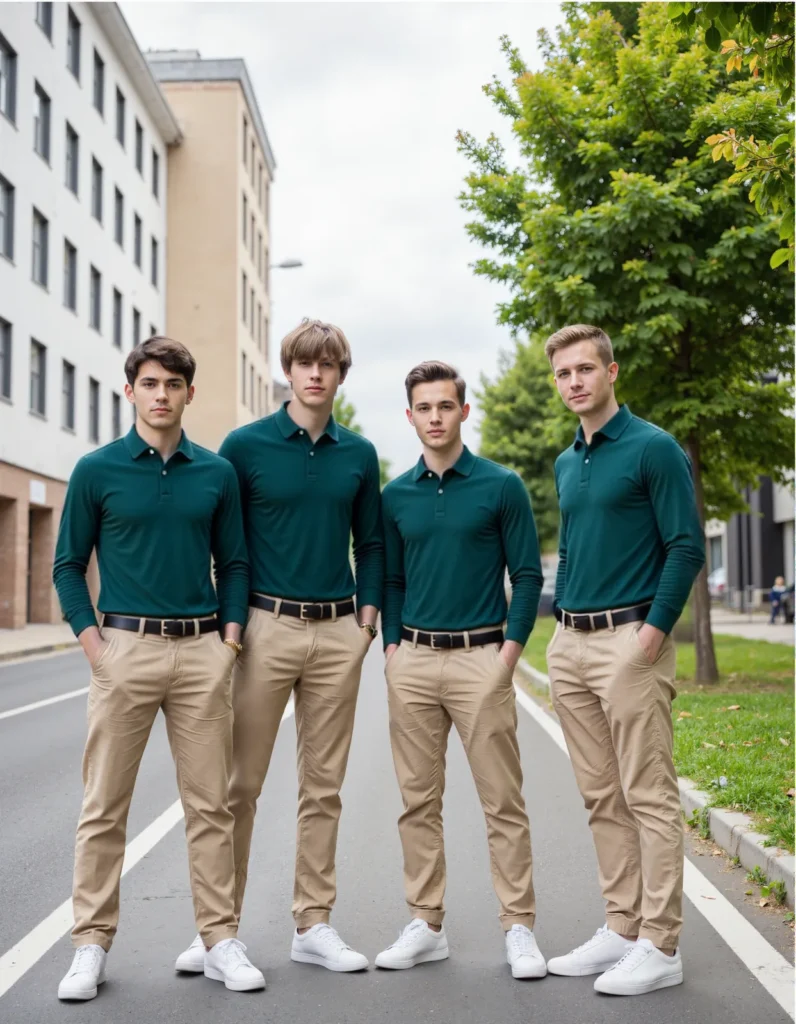 Four men stand on a road outdoors, dressed in matching dark green long-sleeve polo shirts, khaki pants with black belts, and white sneakers. Some have their hands in their pockets, giving a neat and coordinated look. The background includes modern buildings and lush green trees under a bright sky, creating a team-oriented atmosphere.