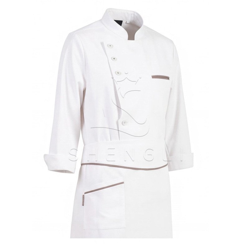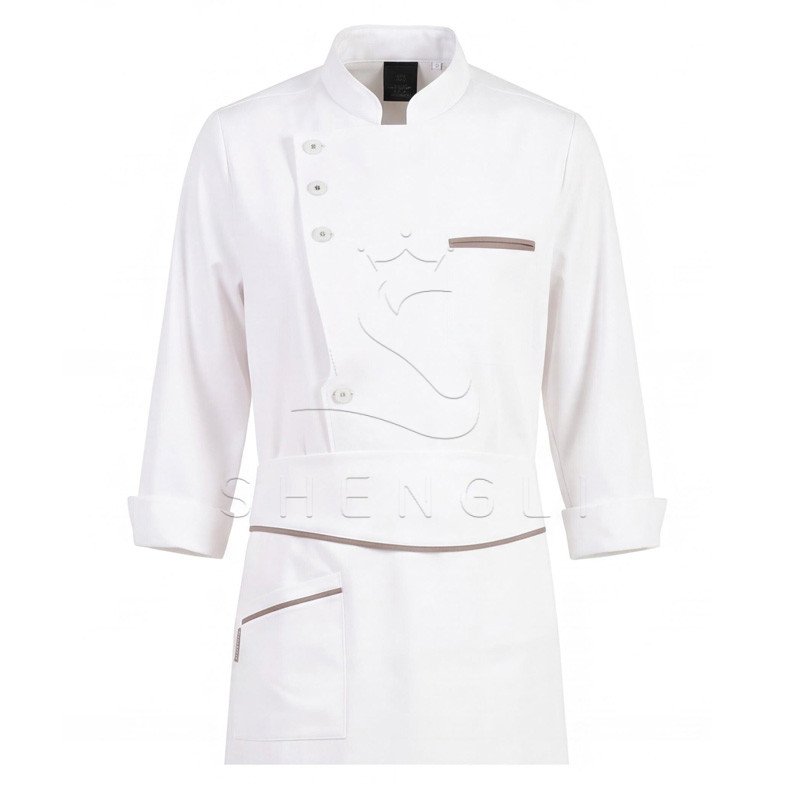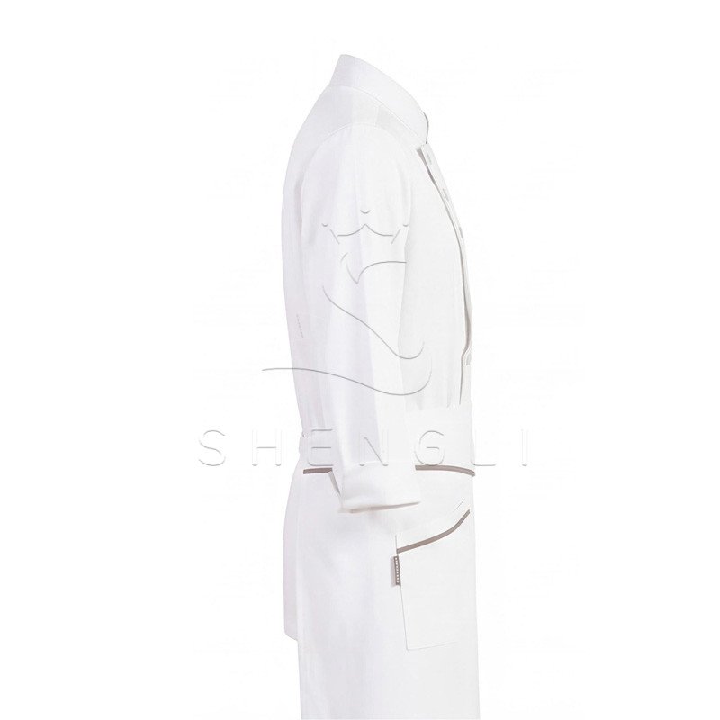 – Stand-up mandarin collar for a polished, traditional chef look