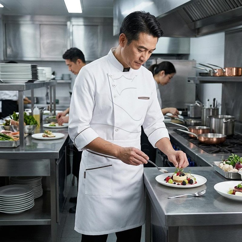 chef coat, chef uniform, professional chef jacket, kitchen uniform, culinary apparel, restaurant chef coat, stain resistant chef jacket, breathable chef uniform, men’s chef coat, women’s chef uniform, catering uniform, hotel kitchen uniform
