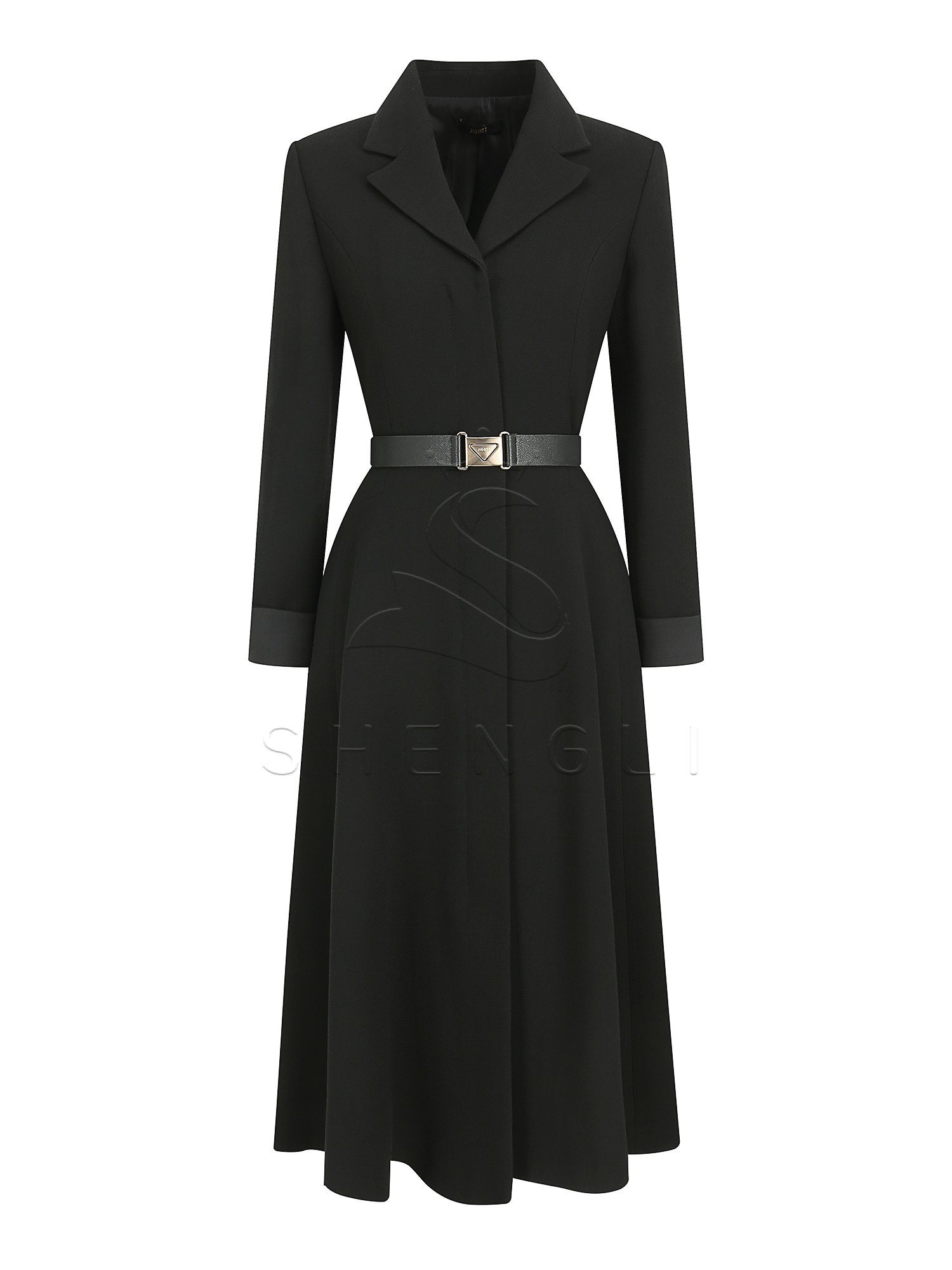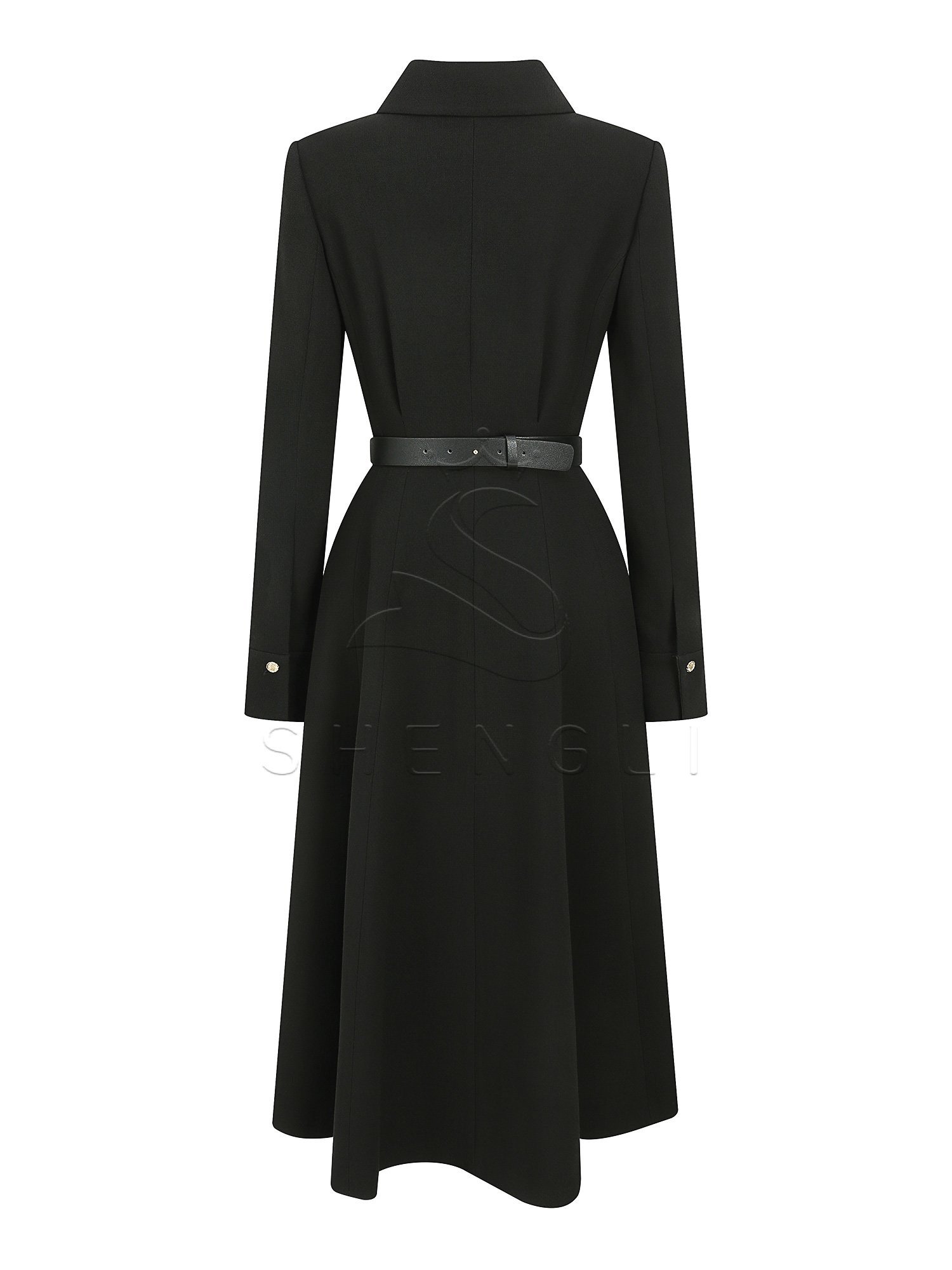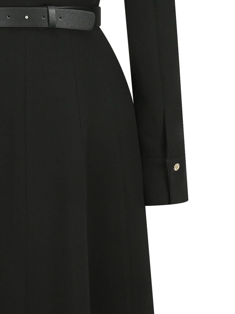Crafted from premium 100% wool, this sophisticated black dress combines feminine elegance with professional appeal. The flared silhouette and open collar create a graceful profile, while the tailored waist and adjustable sleeve cuffs offer both comfort and style. Complete with a matching belt and built-in shoulder pads, this dress delivers exceptional versatility for corporate, hospitality, and retail environments.