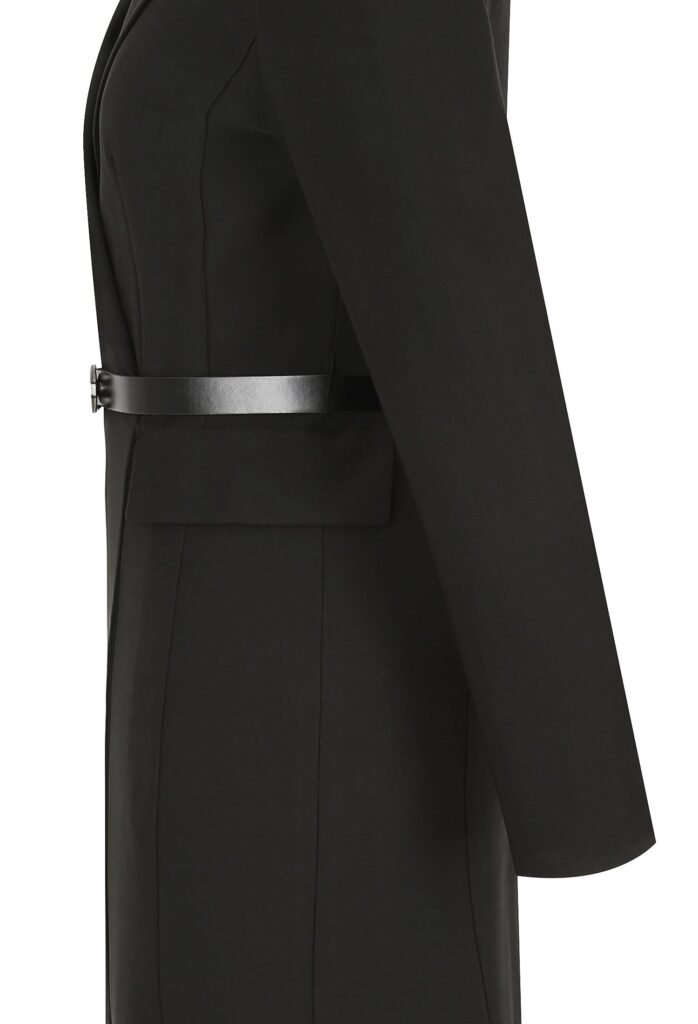 Embrace sophistication with our bespoke black mermaid gown, meticulously crafted to blend professional elegance with dramatic silhouette. This custom work dress features an asymmetrical fishtail hem that flows gracefully while maintaining corporate appropriateness. The carefully sculpted collar and side lapel details create a unique neckline that exudes refined style, complemented by a matching belt to accentuate your natural curves. Perfect for upscale hospitality environments, corporate galas, or executive presentations where making a powerful impression matters.