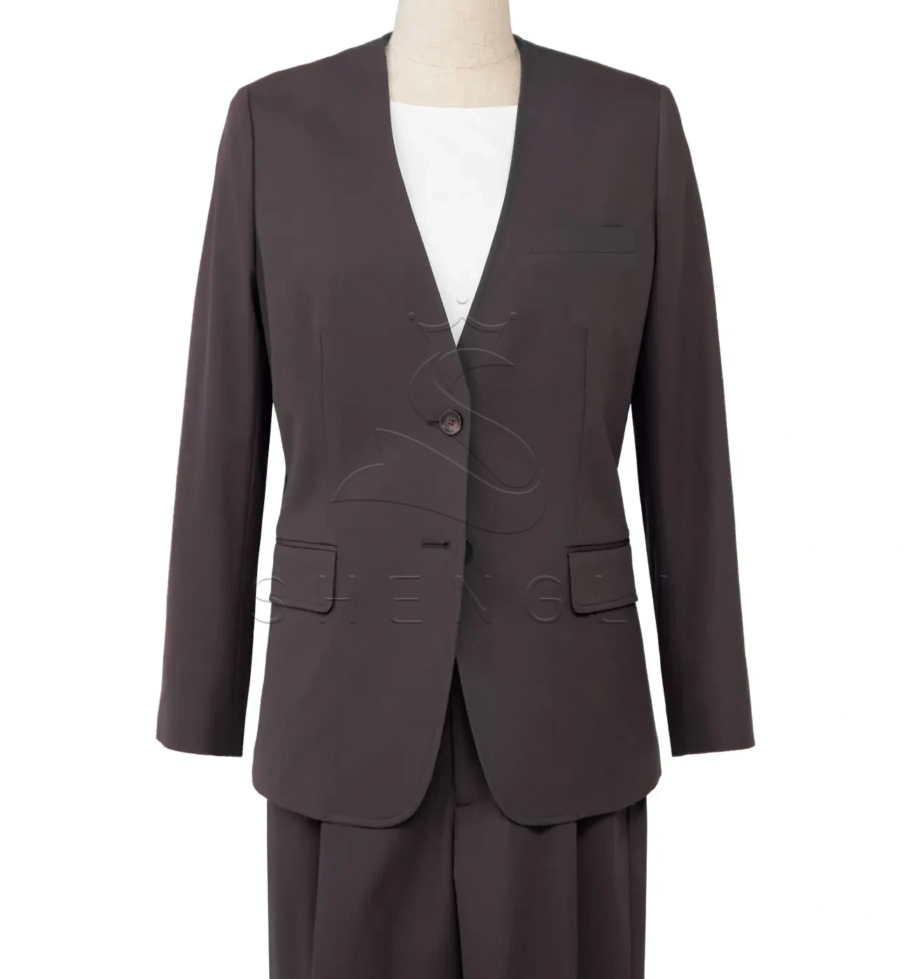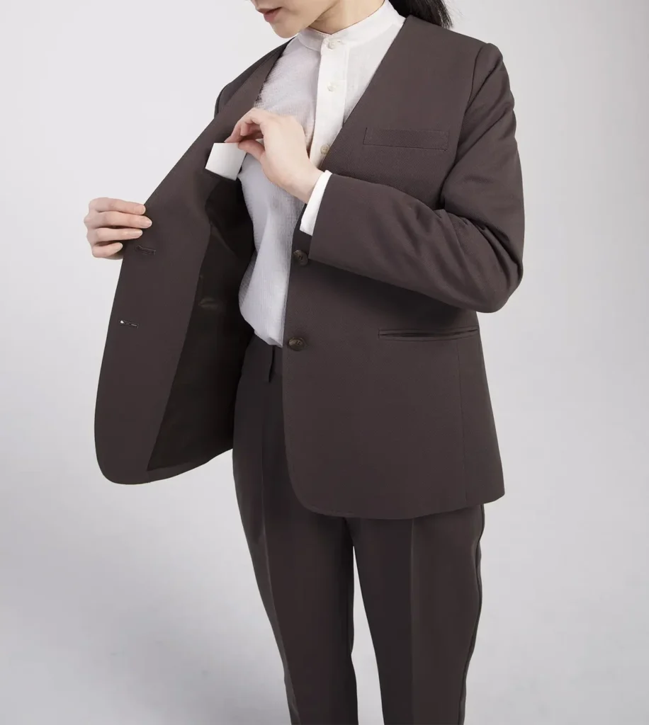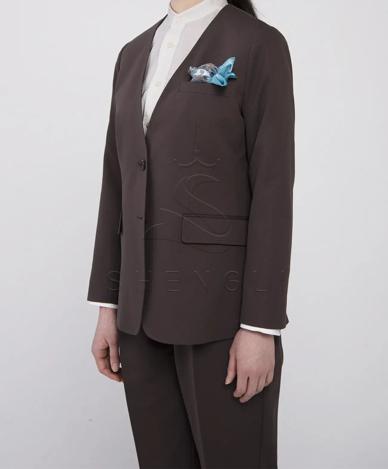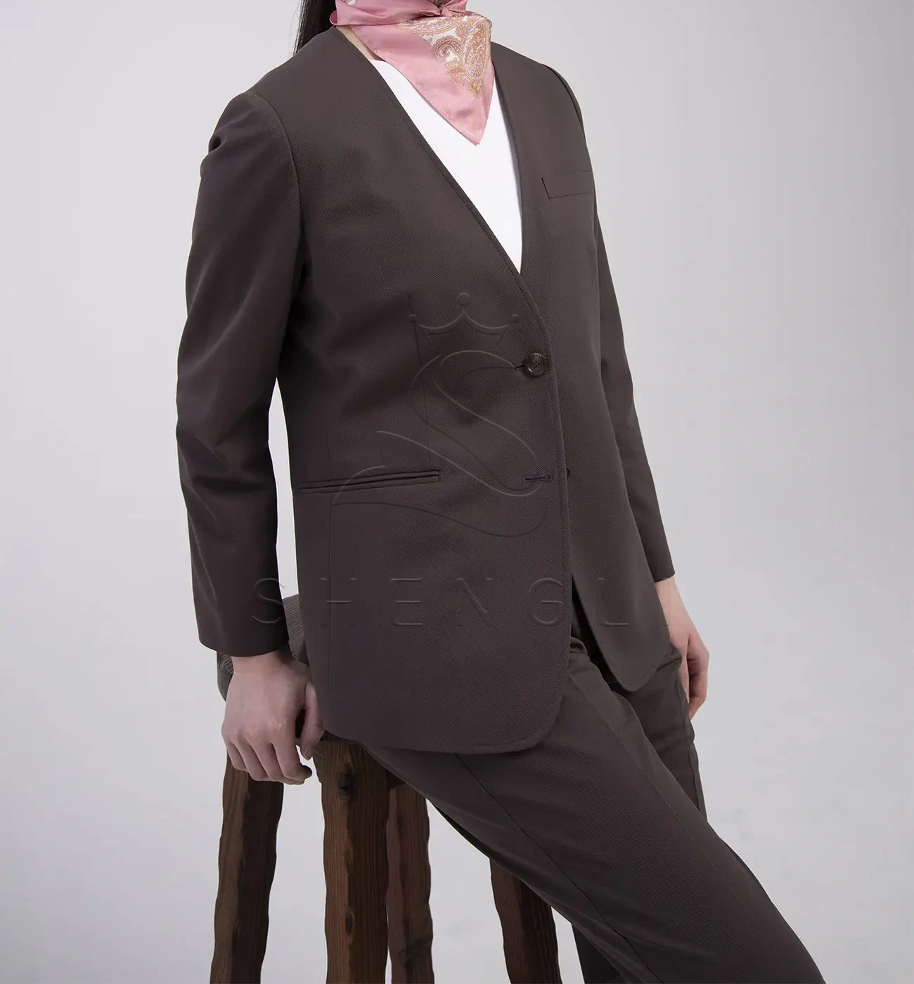 Experience the next evolution in professional attire with our brown collarless suit jacket, meticulously crafted for the modern hospitality industry. This revolutionary garment embodies the perfect balance between relaxed comfort and sophisticated style, featuring advanced fabric technology that ensures all-day ease and mobility. The warm brown hue exudes professional elegance while maintaining a contemporary, gender-free aesthetic suitable for diverse staff members.