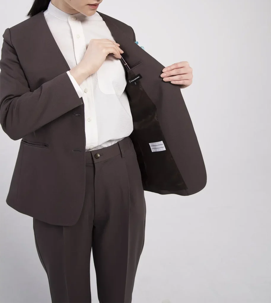 Natural Fit Brown Collarless Suit Jacket | Next-Generation Hospitality Wear | Eco-Friendly Stretch Fabric