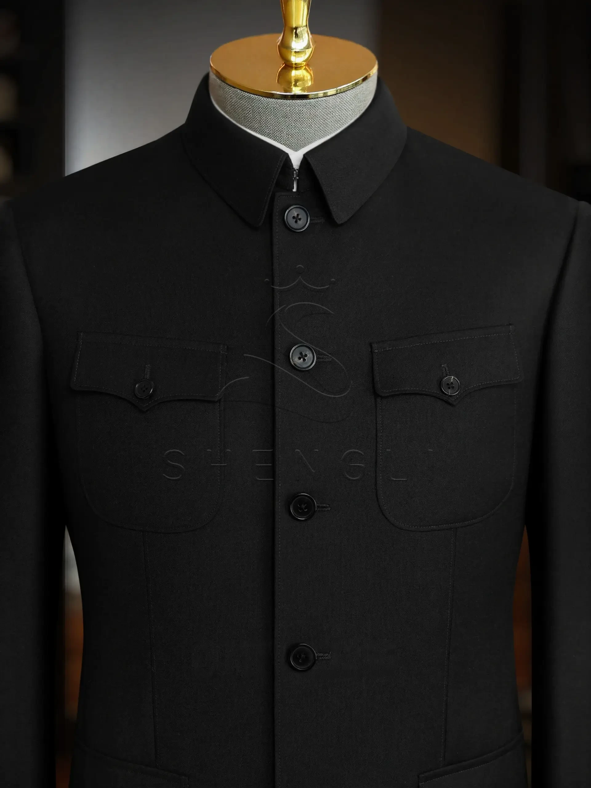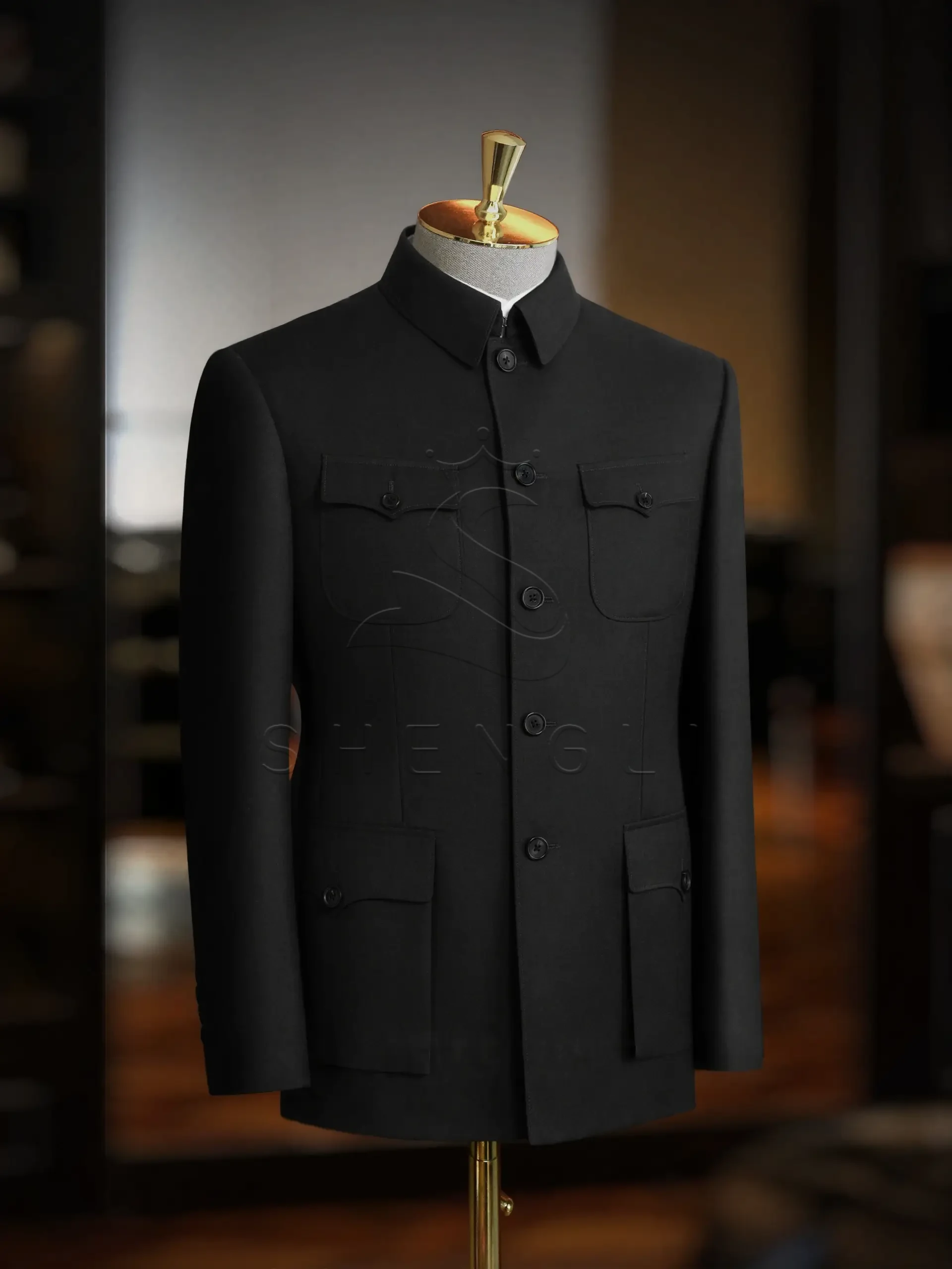 Traditional Zhongshan design with four pockets and structured shoulders